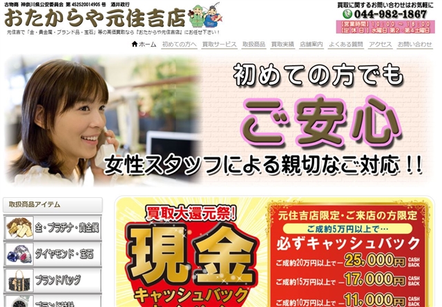 | 買取品目 | 切手、金、プラチナ、貴金属、ブランドバッグ、ダイヤモンド、ジュエリー、宝石、時計、食器、金券、骨董品、化粧品、お酒 |